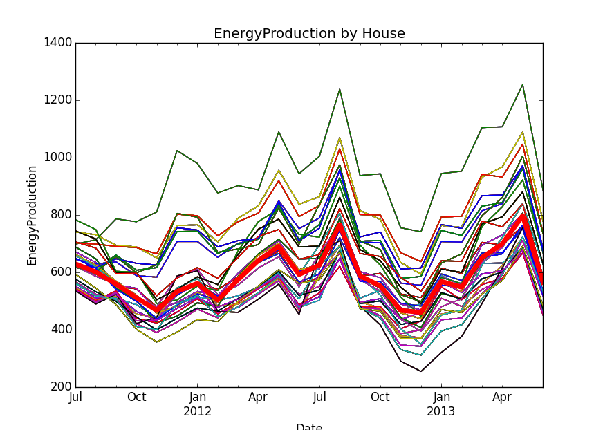 However, to start it will help to see how the different houses compare across the months. I graphed each house’s energy production using the same x-axis of dates. The median is shown as the thick, red line.