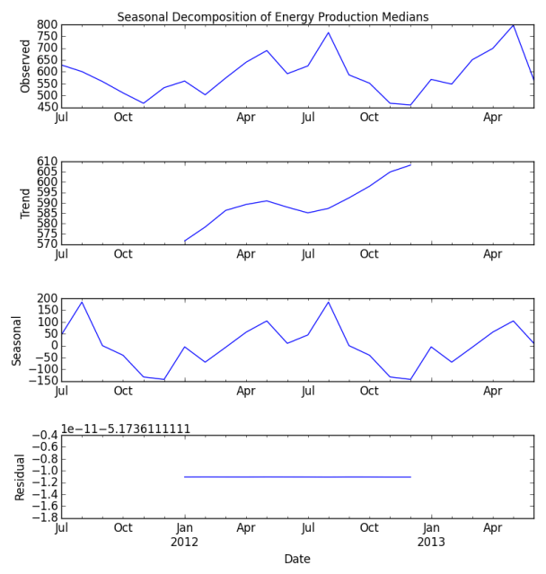 The reason there is trend information lacking for 6 months on the ends is that the convolution filter uses an average of 6 months before and after the position. It runs out of data on either side. The useful information that pops out of these plots is the cyclical pattern of the seasonal information. EnergyProduction seems to be dependent on the seasons. This is similar to what we say when we broke the data down by months. Let’s see if we can make use of this.